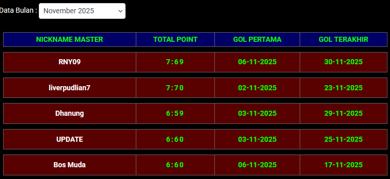 | 1 | liverpudlian7 | 7:70 | 01-12-2025 | 22-12-2025 |